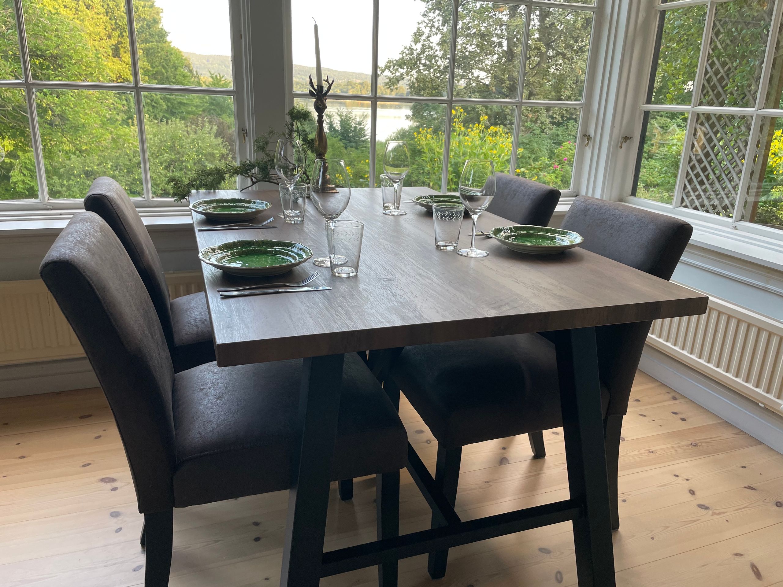 Vår restaurang i glasverandan har en varm och rustik miljö med temat till naturen som inspiration, det är inriktningen för såväl maten som för inredningen. Härifrån blickar du ut över sjön Emten och i fonden berget Billingen. Här finns plats för tolv personer. Är ni ett större sällskap än så, dukar vi istället i salongen med plats för fler. Kontakta Margaretha, för att få ett passande förslag på måltid till just ert sällskap.